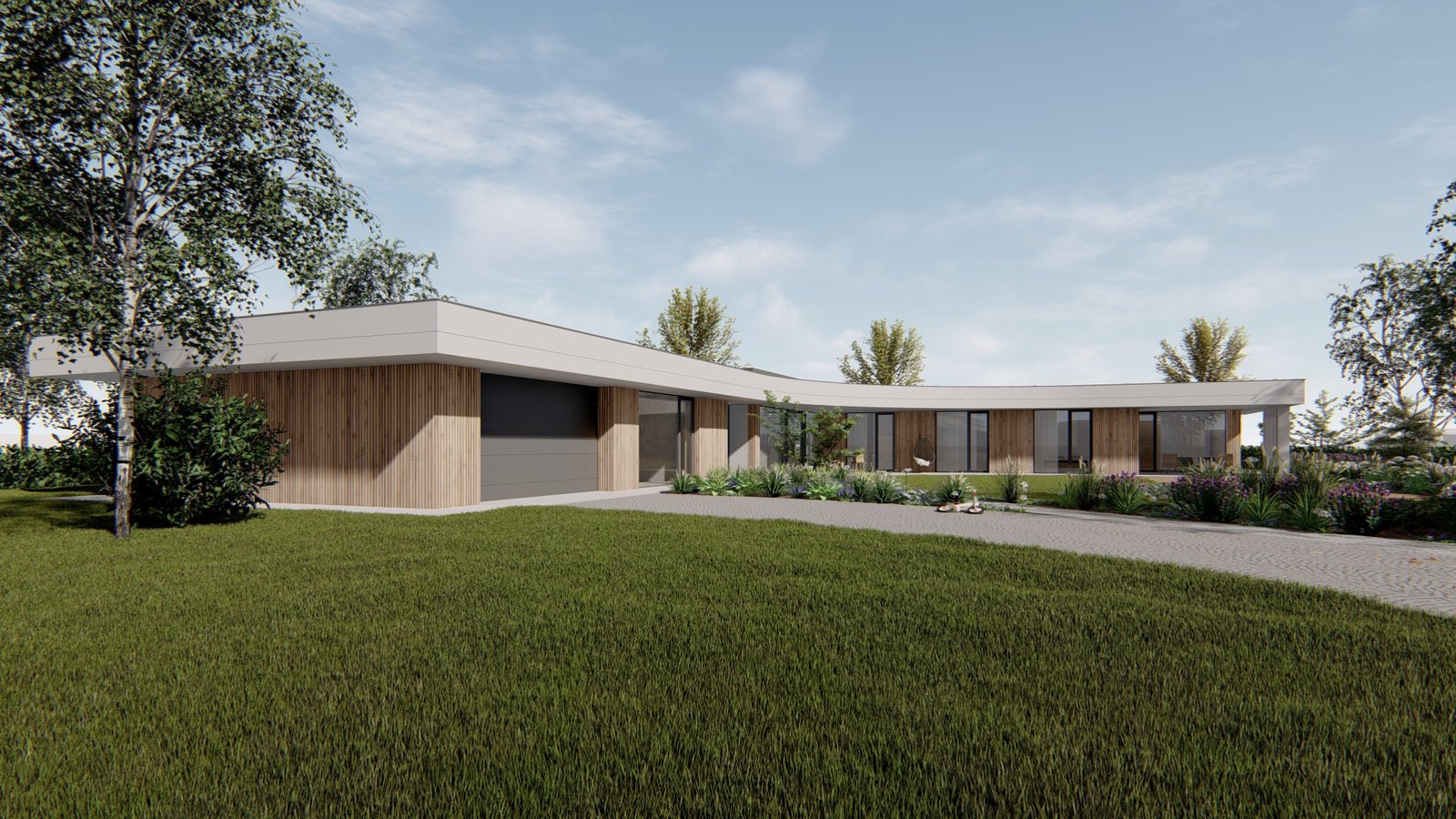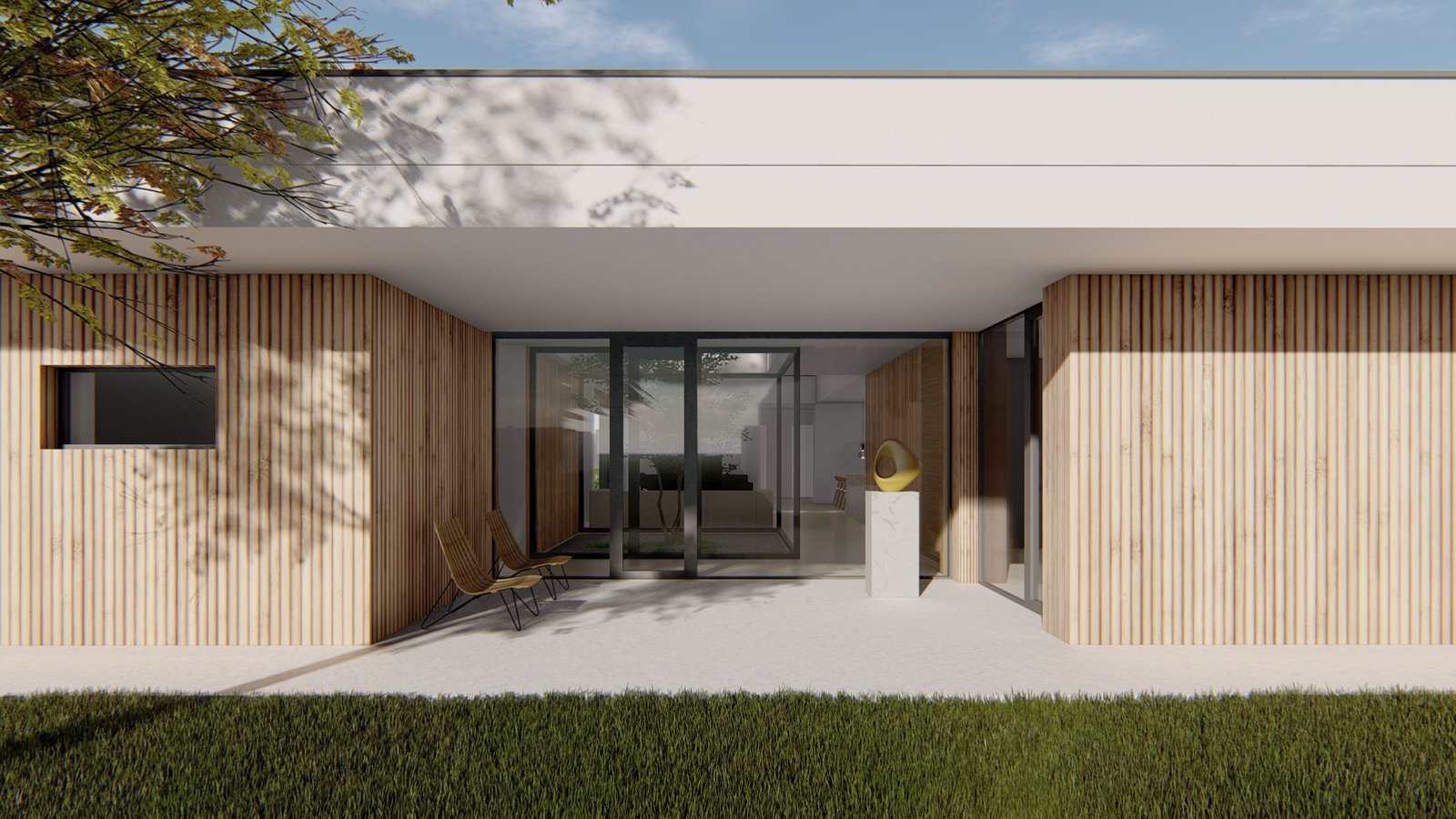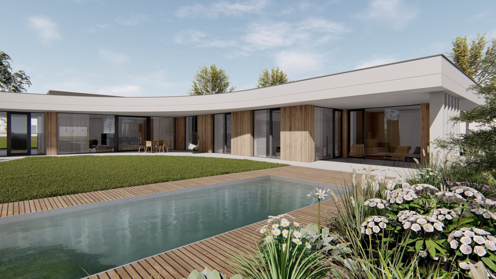 Architektonická studie řeší návrh jednopodlažního rodinného domu ve Svobodných Dvorech v Hradci Králové. Dům reaguje na specifický kontext okrajové zástavby i požadavky klienta. Leží na pozemku za stávající ulicí, s orientací obytných místností do jihozápadní zahrady. Tvar L umožňuje oddělení denní a soukromé části, součástí je i garsoniéra pro hosty. Materiálové řešení staví na dřevěném obkladu, přesazích střechy a velkoformátovém zasklení.