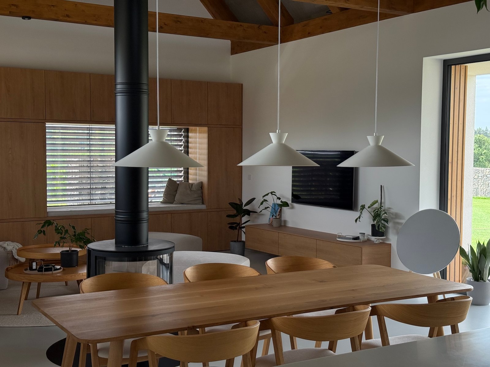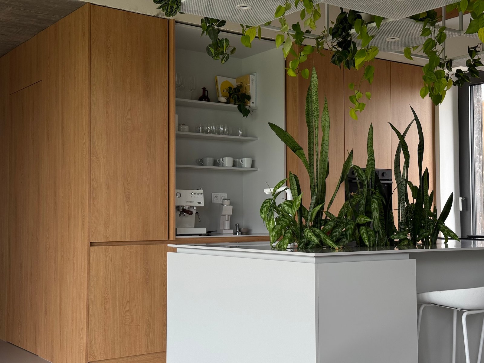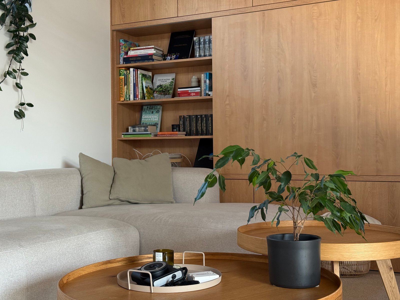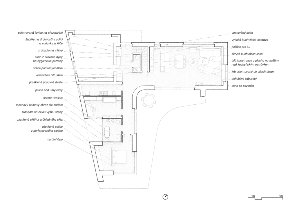 Celý prostor sjednocuje šedá stěrka na podlaze a bílé kovové konstrukce. Výrazným prvkem je také dřevěný dekor, od kuchyně v barvě dubu přes knihovnu s posuvným panelem až po masivní postel. Materiály byly voleny tak, aby interiér působil čistě, vzdušně a útulně zároveň.