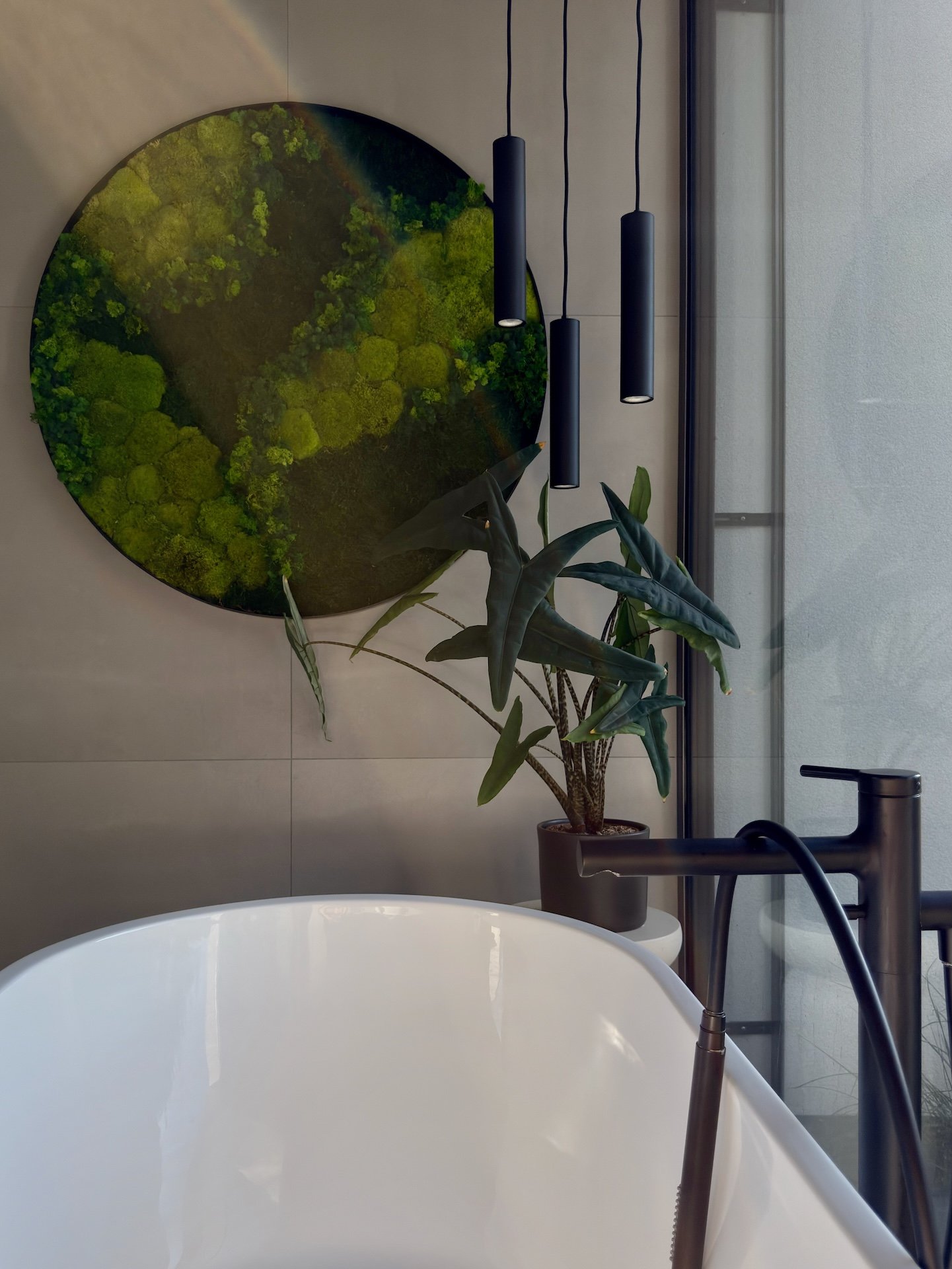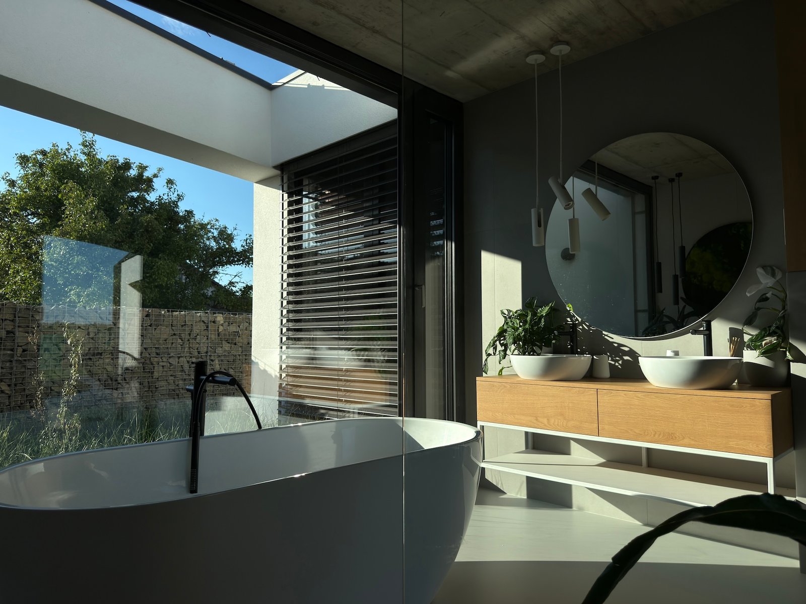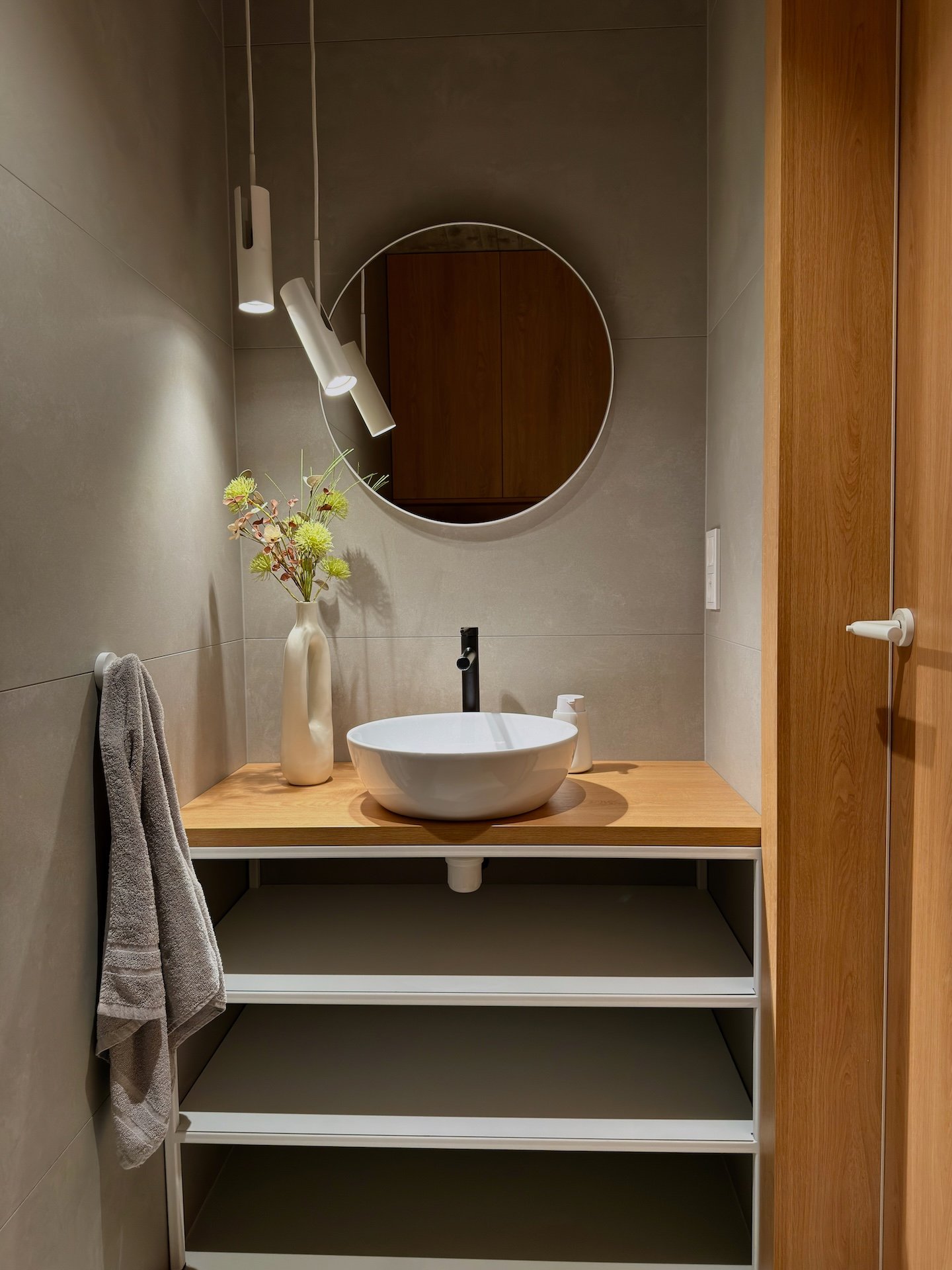 Celý prostor sjednocuje šedá stěrka na podlaze a bílé kovové konstrukce. Výrazným prvkem je také dřevěný dekor, od kuchyně v barvě dubu přes knihovnu s posuvným panelem až po masivní postel. Materiály byly voleny tak, aby interiér působil čistě, vzdušně a útulně zároveň.