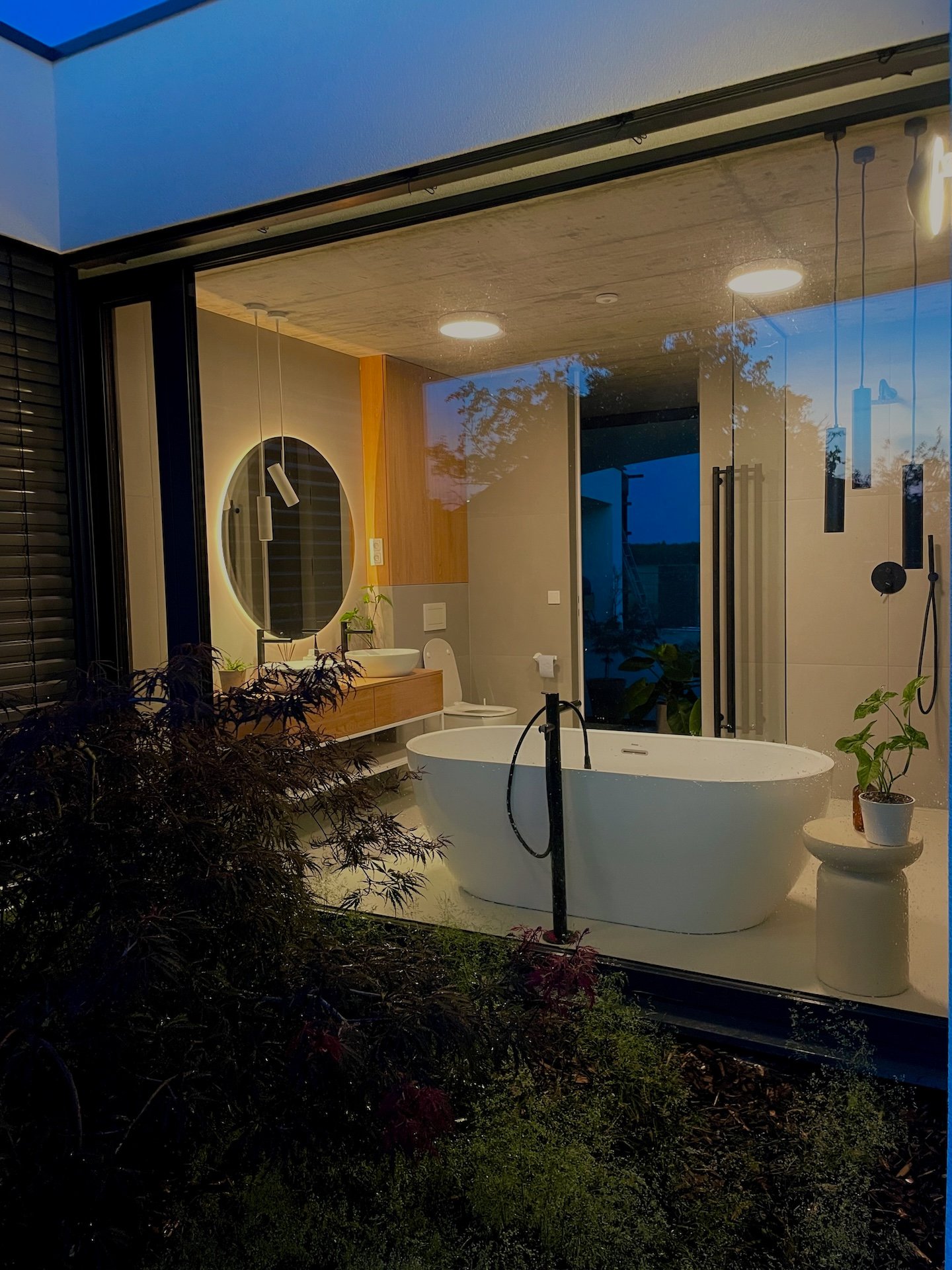 Vnitřní uspořádání domu propojuje kuchyň, jídelnu a obývací část do jednoho plynulého prostoru. Centrem dění je kuchyňský ostrůvek a čtenářské okno, vše doplňuje krb prosklený do všech stran. Dominantní dřevěný „cube“ s kuchyňskou a schodišťovou stěnou propojuje denní zónu s chodbou a pracovnou v patře.